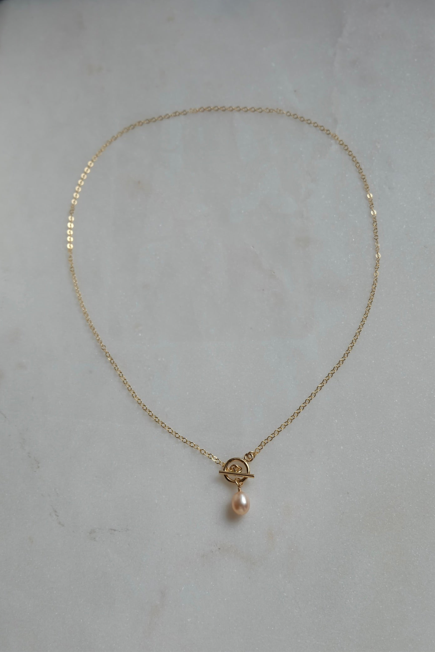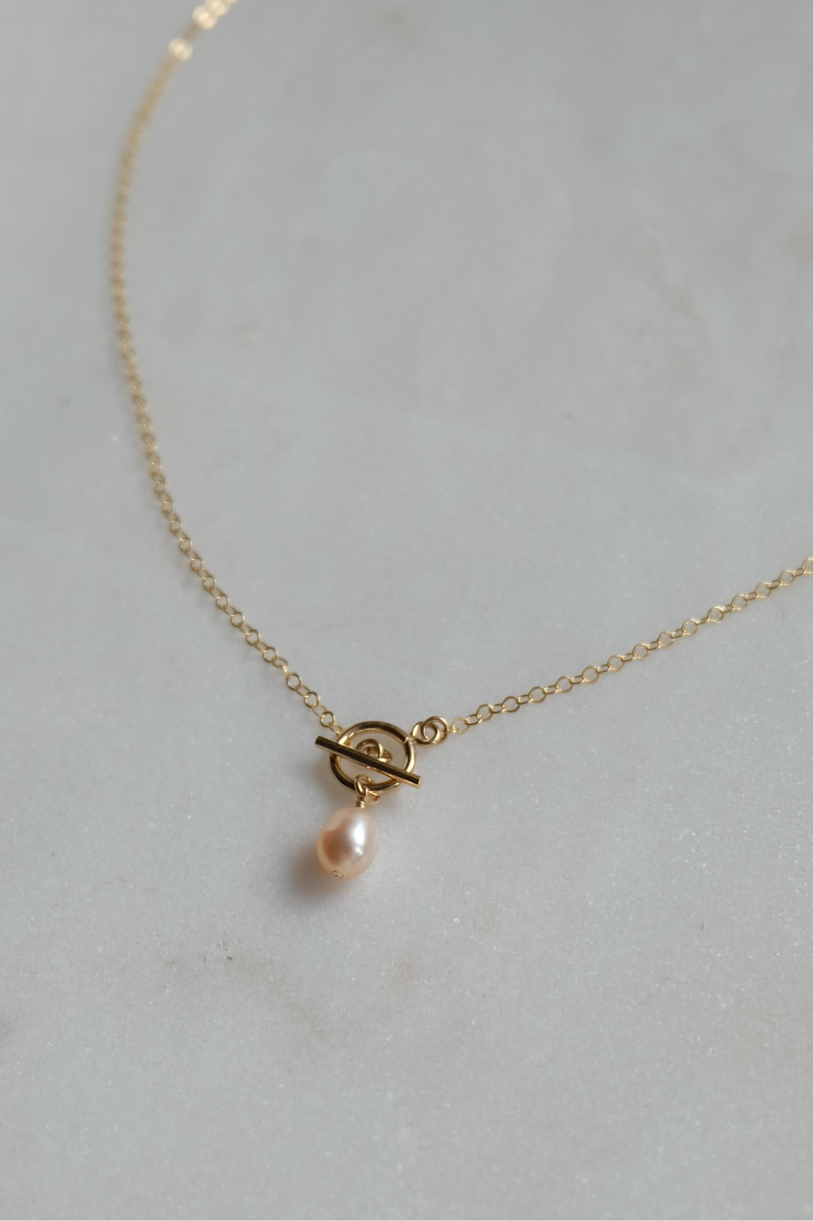 A luminous peach-hued freshwater pearl suspended from a delicate 14K Gold-Filled chain—this minimalist necklace whispers elegance with every movement. The signature toggle clasp adds a modern touch to a classic silhouette, creating a piece that feels both effortlessly refined and deeply personal. Let this necklace become your daily talisman of grace and quiet confidence.