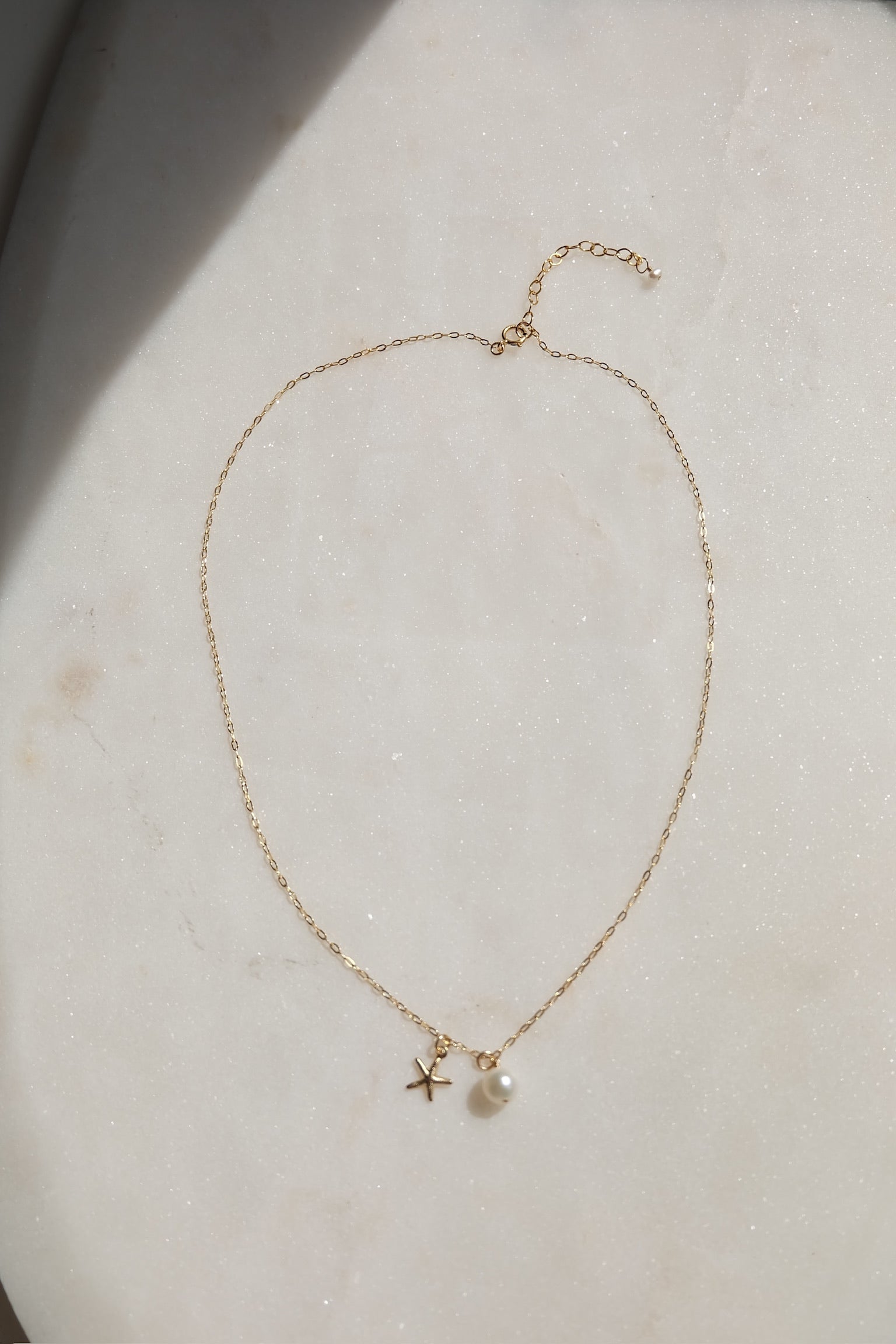- Features: Starfish charm, luminous white pearl accent