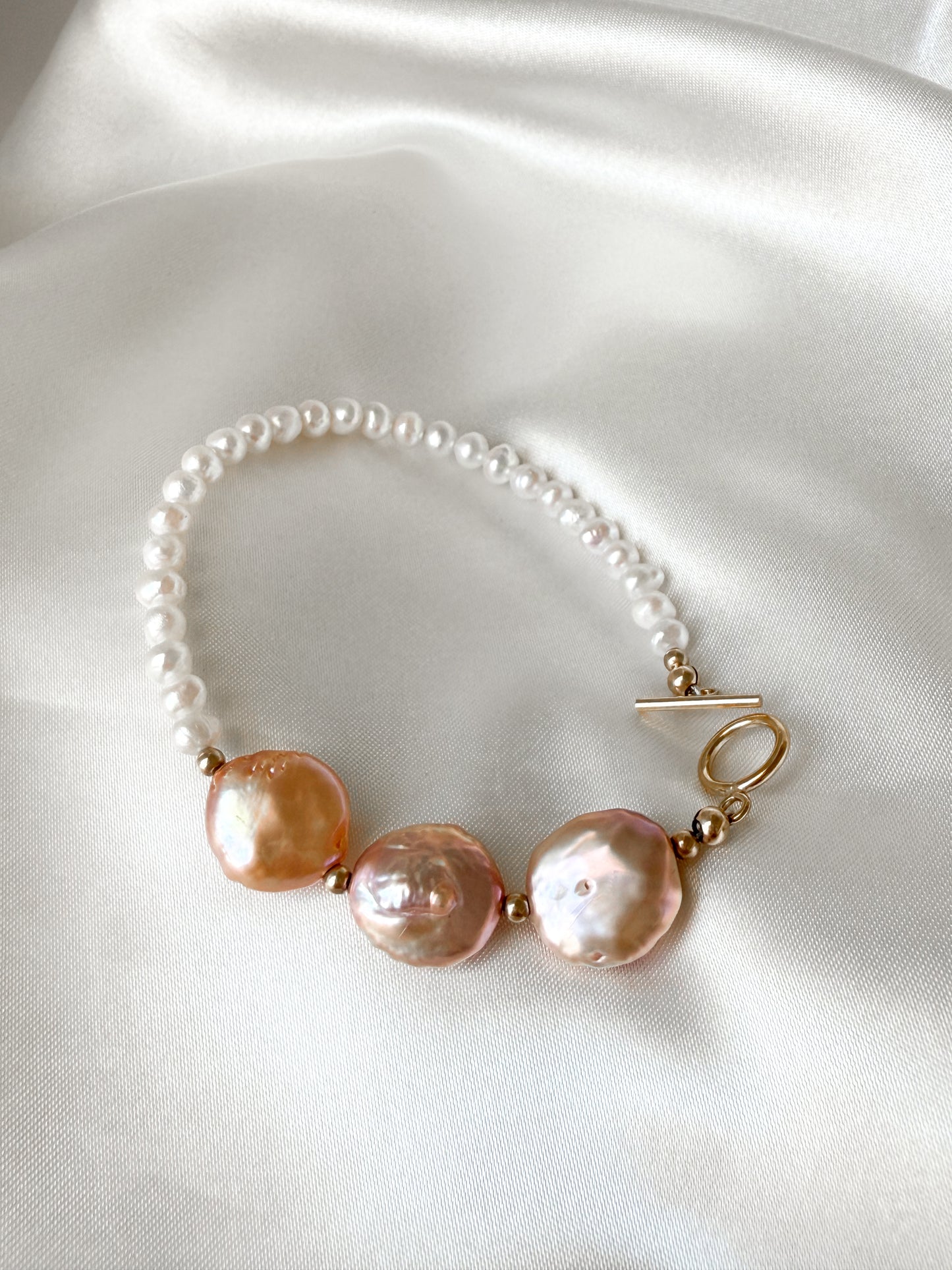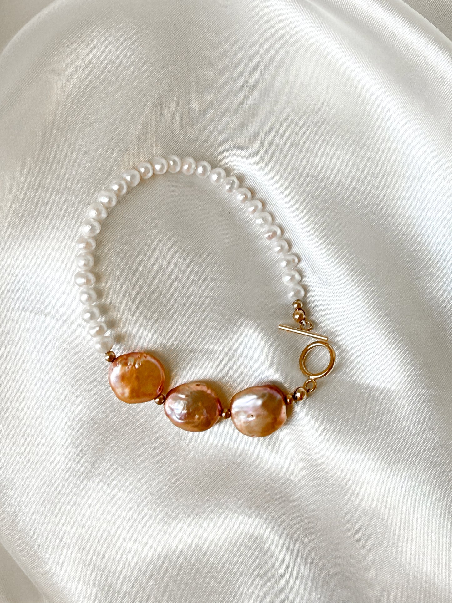 Inspired by sun-kissed shores and the quiet beauty of coastal mornings, The Sandcastle Bracelet captures the essence of timeless grace. Lustrous freshwater pearls meet radiant 14K gold-filled accents in a design that whispers of serenity and strength. Each pearl tells a story of natural beauty, while the golden details evoke the warmth of sunlight dancing on sand.